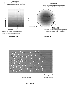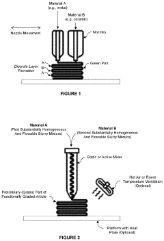 - A slurry feedstock comprising a metal, ceramic, or their combinations, mixed with an organic polymer binder and additives, is used for extrusion-based 3D printing and casting, allowing for the creation of FGMs with varying composition and structure across multiple directions at room temperature and low pressure.