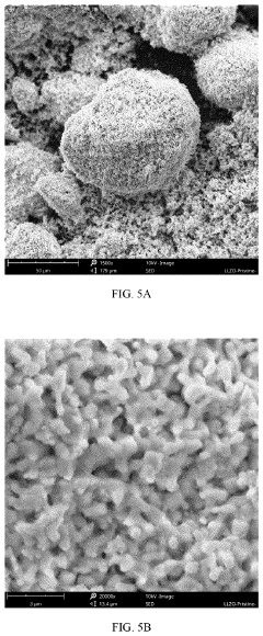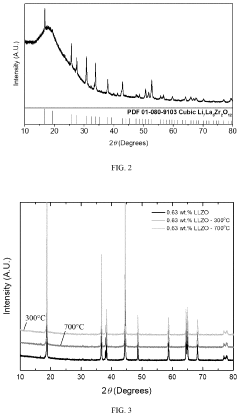 Doping LLZO with various elements improves its compatibility with other battery components. Common dopants include aluminum, gallium, tantalum, and niobium, which stabilize the cubic phase of LLZO and enhance ionic conductivity. These dopants can modify surface properties, reduce grain boundary resistance, and improve wettability with electrodes. Optimized doping strategies lead to better mechanical properties, reduced interfacial resistance, and enhanced electrochemical performance.Expand Specific Solutions05 LLZO composite coatings for enhanced compatibility