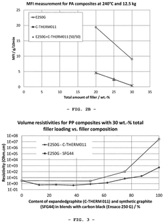 - A composition comprising carbon black and expanded graphite, optimized in terms of weight percentage and particle characteristics, is used to enhance electrical conductivity, EMI shielding, and thermal conductivity, allowing for reduced filler loadings without compromising processability or mechanical properties.