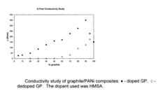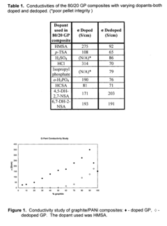 - The development of composites comprising graphite and doped polyaniline, polypyrrole, polythiophene, or polyethylenedioxythiophene with graphite, synthesized by oxidative polymerization in the presence of an acid dopant, resulting in higher conductivity and improved dispersibility in various solvents and resins.