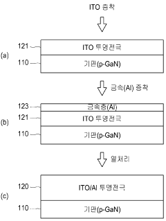 - A method involving the deposition of indium oxide and tin oxide to form an ITO transparent electrode, followed by the formation of a metal layer with elements like Al, Ti, or Ge, which are lower in the periodic table than indium, and subsequent heat treatment to penetrate these metals into the ITO electrode, expanding the effective band gap and improving conductivity.