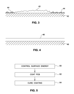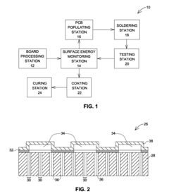 Dip coating methods can be optimized for complex PCB geometries through controlled immersion and withdrawal techniques. By carefully controlling the speed, angle, and duration of the dipping process, consistent coating thickness can be achieved even on boards with varying component heights and densities. Advanced dip coating systems incorporate tilt mechanisms and variable withdrawal rates to prevent coating pooling in recessed areas or insufficient coverage on elevated components. This method is particularly cost-effective for high-volume production while still addressing the challenges of irregular board topographies.Expand Specific Solutions05 Automated robotic coating systems for precision application