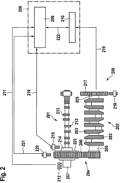 Technical Solution: Schaeffler has developed an innovative crankshaft-camshaft synchronization system called "UniAir" that utilizes electrohydraulic valve control technology. This system enables fully variable control of valve lift and timing, effectively decoupling camshaft rotation from fixed mechanical constraints. Their solution incorporates high-precision hydraulic actuators that can adjust valve timing in real-time based on engine load conditions. Schaeffler's technology features a unique "soft landing" valve control algorithm that reduces impact forces during valve closing, significantly extending component life while maintaining precise synchronization. The system includes integrated temperature compensation that maintains timing accuracy across extreme operating conditions from cold starts to full operating temperature. Their advanced control software continuously optimizes the phase relationship between crankshaft and camshaft positions to maximize power output while minimizing fuel consumption, achieving up to 15% reduction in fuel consumption under certain operating conditions.