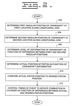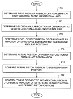 - A method and apparatus that determine the first and second angular positions of the crankshaft at different locations along its longitudinal axis, calculate the deformation, and adjust the piston position accordingly to control the timing of combustion events, ensuring optimal alignment and reducing emissions and inefficiencies.