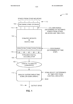 - A superconducting neuromorphic core is developed, incorporating a digital memory array for synapse weight storage, a digital accumulator, and analog soma circuitry to simulate multiple neurons, enabling efficient and scalable neural network operations with improved biological fidelity.