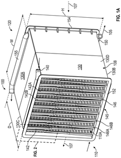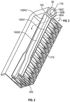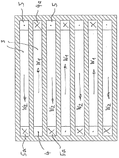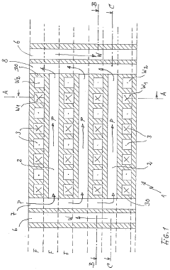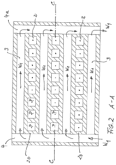 Technical Solution: MAHLE has established comprehensive expertise in both crossflow and counterflow heat exchanger technologies, with particular focus on automotive thermal management systems. Their crossflow designs feature optimized louvered fins with precisely controlled geometries that balance heat transfer performance with acceptable pressure drops. For counterflow applications, MAHLE employs their patented CooLED technology, which creates highly efficient layered flow paths with minimal thermal resistance between hot and cold streams. Their manufacturing processes incorporate advanced automated brazing techniques that ensure consistent joint quality across high-volume production. MAHLE's dual-flow radiators represent a hybrid approach that leverages benefits of both configurations, with measured performance improvements of up to 25% compared to traditional single-pass designs. Their research has demonstrated that optimized counterflow designs can achieve effectiveness values exceeding 95% in certain applications, though often with higher pressure penalties that must be balanced against system requirements.