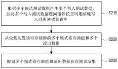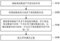 - A test method and device are designed. By generating error correction codes, dividing basic data into multiple sections, generating candidate test data, executing multiple test plans, and writing test data and error correction codes into the device under test, Read mode register values and sense data to generate test results to evaluate link error correction code functionality.