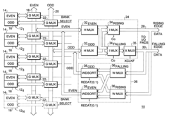 - An integrated clocking latency and multiplexer control technique that combines multiple I/O configurations and latency modes into a single data path, utilizing a series of clock signals to manage data flow efficiently across even and odd memory banks, allowing data to be read and written on both rising and falling edges of the clock, thereby enhancing data transfer frequency without increasing clock frequency.