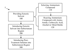 - The use of deep eutectic solvents, specifically formed by reacting quaternary ammonium compounds with hydrogen bond donors such as amides, carboxylic acids, and alcohols, to solubilize up to 30 wt% cellulosic material, allowing for their removal from subterranean regions, and these solvents are introduced as additives in drilling or fracturing fluids.
