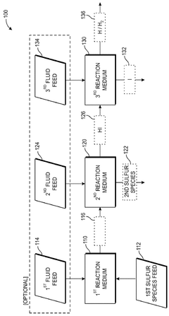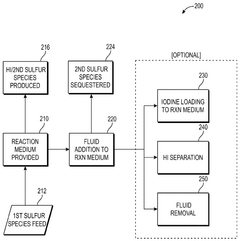 - The use of deep eutectic solvents and ionic liquids as catalysts in a reaction medium with iodine species to process sulfur species, converting hydrogen sulfide into elemental sulfur and hydrogen iodide, allowing for efficient recycling and reducing waste, while also enabling the production of valuable hydrogen products.