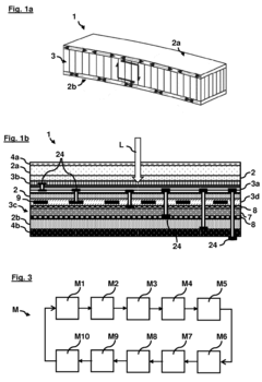 Technical Solution: Airbus has developed a multifunctional structural battery composite (SBC) system for aircraft wing skins and fuselage panels that integrates energy storage directly into load-bearing structures. Their approach uses carbon fiber reinforced polymer (CFRP) as both structural material and battery electrode substrate. The system employs a sandwich design with carbon fiber layers serving as current collectors and electrodes, separated by a solid-state electrolyte that maintains structural integrity. Airbus has demonstrated up to 35% weight reduction compared to conventional separate battery and structure systems. Their technology incorporates self-healing capabilities to address microcracks and utilizes advanced manufacturing techniques including automated fiber placement (AFP) for precise layup of battery-integrated composites. The system includes thermal management solutions to maintain optimal battery operating temperatures during flight conditions.