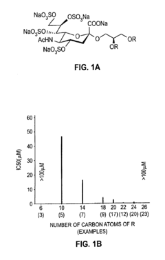 - Development of sulfated nonulonic acid derivatives with all hydroxyl groups sulfated, specifically targeting the anomeric position of monosaccharide-lipid or nonulonic acid moieties with O-glycosidic, S-glycosidic, or amide linkages, and branched lipid structures to create compounds with reduced anticoagulant activity and lower cytotoxicity for effective anti-HIV activity.