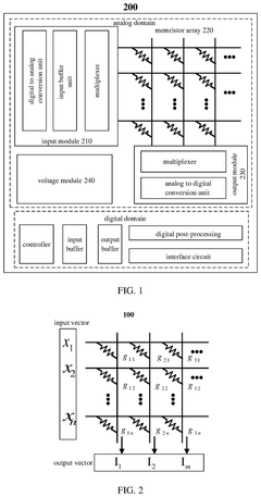 Managing thermal effects and aging in memristor devices is crucial for maintaining reliability in in-memory computing applications. Techniques include temperature compensation algorithms, adaptive programming schemes, and specialized circuit designs that mitigate the impact of temperature variations and device aging. These approaches help maintain consistent resistance states over time, ensuring computational accuracy and extending device lifetime.Expand Specific Solutions03 Redundancy and fault tolerance architectures