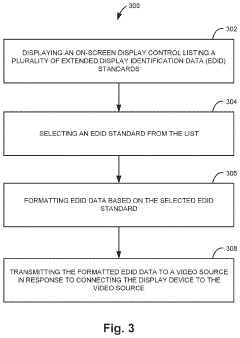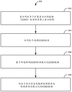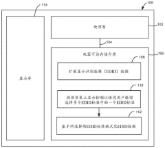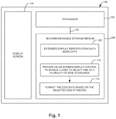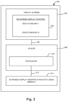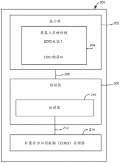 Technical Solution: Sony has implemented a sophisticated approach to DisplayPort 2.1 EDID/CTA data blocks management, leveraging their extensive experience in professional broadcasting and consumer electronics. Their solution features a precision timing controller that can detect and resolve conflicts between different video timing standards, particularly important for their professional monitors used in content creation. Sony's HDR metadata implementation is particularly advanced, supporting multiple HDR formats including Dolby Vision, HDR10, HLG, and their own proprietary technologies. Their system includes specialized CTA data blocks for professional color grading applications, with precise gamma and color space information. For debugging, Sony has developed a comprehensive DisplayPort analyzer tool that can capture and decode all EDID/CTA data blocks, visualize timing diagrams, and identify potential compatibility issues. Their implementation also includes a unique metadata verification system that ensures HDR content is accurately represented across different display technologies, with particular attention to preserving creative intent from content production to consumer viewing.