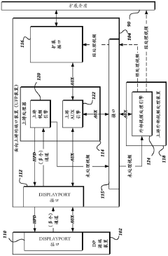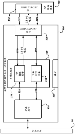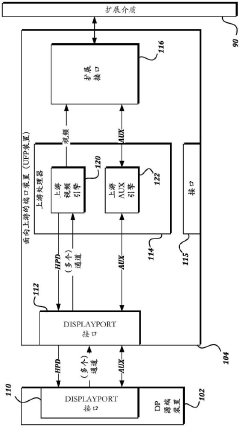 Technical Solution: Samsung has pioneered an advanced DisplayPort 2.1 implementation with particular focus on the FRL/DP interoperability challenges in high-resolution display applications. Their solution incorporates a Dynamic Link Training system that continuously adapts to changing signal conditions, particularly beneficial for mobile devices where environmental factors can fluctuate. Samsung's implementation features a comprehensive Sink Capability Discovery mechanism that not only reads standard DPCD registers but also performs advanced feature detection through proprietary extensions. For training states, Samsung employs a Parallel Processing approach that simultaneously evaluates multiple lane configurations to minimize training time. Their fallback system implements a Hierarchical Quality Reduction strategy that intelligently reduces specific visual parameters based on content type - preserving text clarity in productivity applications while maintaining color accuracy in creative workloads. Samsung has also developed an innovative Fast Recovery mechanism that can restore previous working configurations within milliseconds when transient interference occurs.