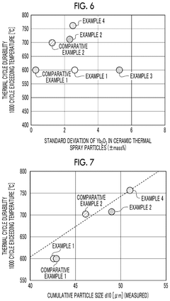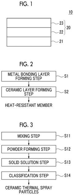 Ceramic materials such as yttria-stabilized zirconia (YSZ) are commonly used in thermal barrier coatings due to their excellent thermal insulation properties. These materials can be modified with various dopants to enhance their durability and performance at high temperatures. The composition of the ceramic material significantly affects the coating's resistance to thermal cycling, oxidation, and erosion, which are critical factors for long-term durability in high-temperature applications.- Ceramic composition for thermal barrier coatings: Various ceramic materials are used in thermal barrier coatings to provide high temperature resistance and durability. These include yttria-stabilized zirconia (YSZ), rare earth zirconates, and other advanced ceramic compositions that offer superior thermal insulation properties. The specific composition of these ceramics significantly affects their thermal cycling resistance, phase stability, and overall durability in high-temperature applications.