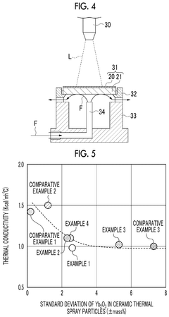 - Deposition methods affecting coating durability: The method used to deposit ceramic thermal barrier coatings significantly impacts their microstructure and durability. Common deposition techniques include air plasma spraying (APS), electron beam physical vapor deposition (EB-PVD), and solution precursor plasma spray (SPPS). Each method produces distinct microstructures with different porosity levels, columnar structures, and strain tolerance capabilities, which directly affect the coating's resistance to thermal cycling, erosion, and foreign object damage.