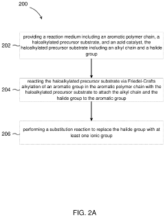 - The development of an ion exchange membrane system using a polymer with an aromatic chain, an alkylated substrate, and at least one ionic group, where the alkylated substrate is bound to the aromatic polymer chain via Friedel-Crafts alkylation, allowing for the use of inexpensive acid catalysts and controlling the degree of functionalization and alkyl tether length through Friedel-Crafts alkylation and substitution reactions.
