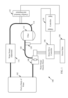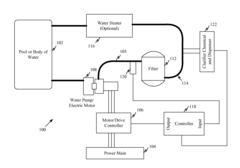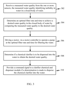 - A closed-loop circulation/filtration system that uses turbidity and suspended solids sensors to dynamically adjust the filtration rate and time based on real-time water clarity, optimizing energy use and water quality by controlling the pump's speed and operation through a system controller.