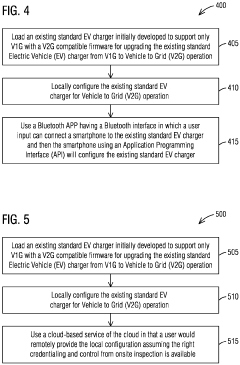 - A method that involves loading existing standard AC EV chargers with V2G compatible firmware and authorizing local configuration via the cloud to enable V2G functionality, utilizing ISO15118 standard capabilities for bi-directional charging/discharging, and configuring maximum current settings through user input or DIP switches.