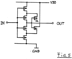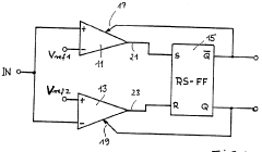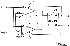 - A Schmitt trigger design featuring two comparators with opposite threshold settings and a switching state memory circuit, where one comparator is in a currentless state below its threshold and the other above, with a bistable flip-flop controlling power-off to minimize current consumption during switching states.