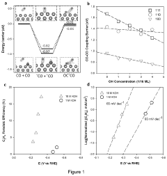 Technical Solution: The University of Michigan has developed advanced nanostructured interfaces for electrocatalytic CO2 reduction featuring precisely engineered copper-based catalysts. Their approach focuses on controlling the morphology, facet exposure, and local electronic environment of copper surfaces to enhance C-C coupling reactions. Their researchers have pioneered plasma-treated copper catalysts with oxygen-derived subsurface species that significantly enhance ethylene and ethanol production with Faradaic efficiencies exceeding 60%. The Michigan team has developed innovative tandem catalyst systems where copper interfaces are combined with molecular co-catalysts that work synergistically to improve product selectivity. Their recent breakthroughs include the development of bimetallic interfaces with Cu-Ag and Cu-Au compositions that leverage electronic effects to tune binding energies of key intermediates. These catalysts demonstrate remarkable stability under industrially relevant conditions, maintaining high performance for over 200 hours of continuous operation at current densities above 200 mA/cm².