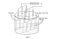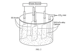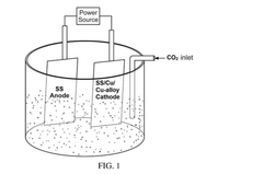 - 03 Reactor design and system optimization for CO2 electroreductionThe design of electrochemical reactors and system optimization are critical for efficient CO2 valorization. Innovations include flow-cell configurations, gas diffusion electrodes, and membrane electrode assemblies that enhance mass transport and reduce energy consumption. Parameters such as electrolyte composition, pH, temperature, pressure, and applied potential significantly influence reaction pathways and product distribution. Advanced reactor designs aim to overcome limitations like low CO2 solubility in aqueous media and concentration polarization effects.Expand Specific Solutions
