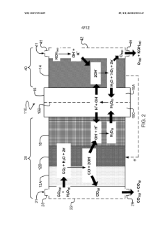 - 04 Electrolyte engineering for enhanced CO2 conversionThe composition and properties of the electrolyte solution significantly influence the performance of CO2 electroreduction processes. Electrolyte engineering involves optimizing pH, ionic strength, and buffer capacity to enhance CO2 solubility and mass transport to the electrode surface. Specific ions can promote certain reaction pathways or suppress unwanted side reactions like hydrogen evolution. Advanced electrolytes, including ionic liquids and deep eutectic solvents, offer unique properties that can improve reaction selectivity and efficiency in CO2 valorization processes.Expand Specific Solutions