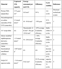 - Redox-active polymer sorbents for electrochemical carbon capture: Redox-active polymers can be utilized as effective carbon capture sorbents where the binding affinity for CO2 is modulated through electrochemical control. These polymers contain functional groups that can undergo reversible redox reactions, changing their electronic properties and thus their interaction with CO2 molecules. By applying appropriate electrical potentials, the polymers can switch between states that either strongly bind or release carbon dioxide, enabling an electrochemically driven capture and release cycle.