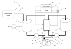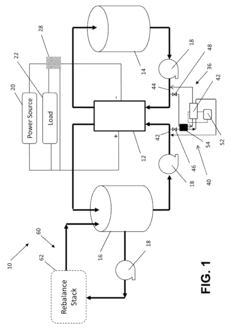 Sophisticated monitoring and control systems can be integrated into flow battery installations to continuously track electrolyte composition and automatically implement rebalancing procedures when needed. These systems typically include sensors for measuring parameters such as pH, conductivity, and redox potential, along with control algorithms that determine when and how to adjust the electrolyte composition to maintain optimal performance.Expand Specific Solutions05 Hydraulic rebalancing and electrolyte circulation strategies