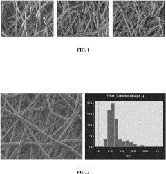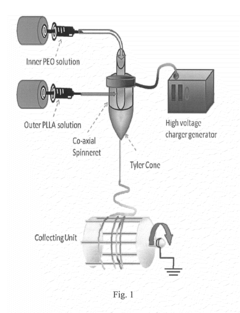 Electrospun nanofibers have diverse applications across multiple fields due to their high surface area-to-volume ratio and tunable properties. They are used in filtration systems, tissue engineering scaffolds, wound dressings, drug delivery systems, and energy storage devices. In biomedical applications, the fibers can mimic extracellular matrix structures, supporting cell growth and tissue regeneration. For environmental applications, nanofiber membranes offer efficient filtration of contaminants from air and water.Expand Specific Solutions05 Coaxial and multi-axial electrospinning techniques