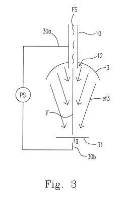 Technical Solution: Corning has developed proprietary electrospinning equipment focused on ceramic and glass fiber production, leveraging their materials expertise. Their systems feature specialized high-temperature spinnerets capable of operating at up to 300°C, allowing for processing of high-melting-point materials. Corning's equipment incorporates precision flow control systems that maintain material delivery with ±0.5% accuracy, critical for producing uniform fibers with diameters as small as 100nm. Their technology includes patented collector designs that enable the creation of complex 3D architectures and aligned fiber arrays for applications in filtration, catalysis, and energy storage. Corning's systems also feature integrated in-line characterization tools that monitor fiber formation in real-time, allowing for automated process adjustments to maintain quality. This equipment is particularly valuable for producing specialized ceramic membranes with controlled porosity and surface functionality.