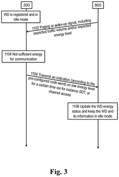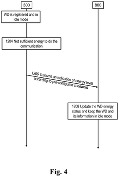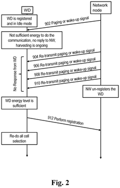 - A method where the network node and energy harvesting wireless device collaborate to preserve the UE context during low energy conditions, allowing the device to inform the network of insufficient power levels and delaying registration procedures until sufficient energy is harvested, reducing latency and energy consumption.