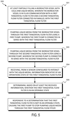 - A perfusion cell culture apparatus with dual filtration systems connected in parallel, equipped with sensors and automated controllers that detect filter failures and adjust media flow to maintain perfusion rates without shutting down the operation, ensuring continuous cell culture by isolating the malfunctioning filter and increasing flow through the operational one.