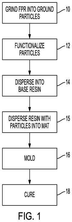 - A method involving the recycling of CFRPs through grinding, functionalizing, and dispersing functionalized particles into a base resin, followed by shaping and curing to produce parts, using high glass transition temperature epoxy resins and chemically bonded particle networks for improved mechanical properties and recyclability.