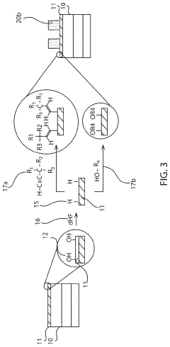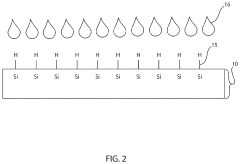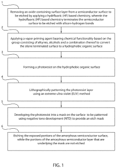 - The method involves stripping the native oxide layer from the silicon surface using diluted hydrofluoric acid to create a silane-terminated surface, followed by applying a vapor priming agent with alkynes or alcohols to form a hydrophobic organic surface, enhancing the adhesion of EUV resists during TMAH development.