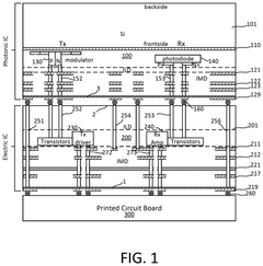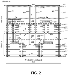 Efficient optical coupling between photonic components and external optical fibers remains a key challenge in silicon photonics packaging. Various solutions have emerged including edge coupling, grating couplers, and automated active alignment techniques. These approaches aim to minimize coupling losses while enabling scalable manufacturing processes. Innovations in this area focus on maintaining sub-micron alignment precision during assembly and throughout the product lifecycle despite thermal and mechanical stresses.Expand Specific Solutions03 Integration of electronics and photonics