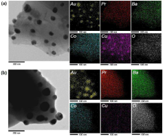 - A perovskite catalyst with a Praseodymium-Barium-Cobalt-Oxygen structure doped with copper and featuring gold nanoparticles formed through sputtering and heat-treatment, allowing stable gold nanoparticle formation on the surface.