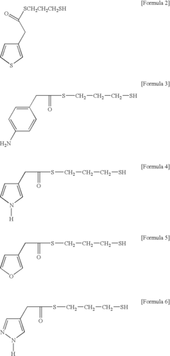 - A monomer for binding nano-metal, represented by Formula 1, is used to create a conductive polymer composite with a nano-metal rod, where the monomer is attached to the nano-metal surface and then polymerized with a conductive polymer monomer and dopant, enhancing electrical conductivity and maintaining transparency and flexibility.