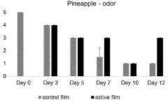 - A combination of citral, hexanal, and linalool is incorporated into a polymeric matrix within packaging materials, providing a synergistic antimicrobial effect that enhances preservation without substantial organoleptic changes, achieved through melt mixing and processing techniques such as extrusion or injection to form a multilayer structure.