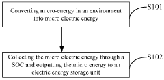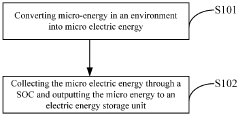 - A micro-energy collection method and device that converts micro-energy into micro-electric energy using a conversion unit and collects it through a System on Chip (SOC), reducing power consumption and enabling the collection of micro-ampere level currents, with segmented collection techniques and adaptive detection modes to optimize energy collection across varying environments.
