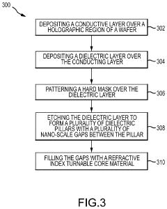 Technical Solution: Carl Zeiss SMT has developed advanced lithography-based fabrication methods for large-area LiDAR metasurfaces. Their approach utilizes extreme ultraviolet (EUV) lithography systems capable of producing nanoscale features with precision down to 13.5 nm wavelength. For LiDAR metasurfaces, they employ a multi-step process combining deep UV lithography with proprietary phase-shifting techniques to create large-area (>100 cm²) metasurfaces with uniform optical properties. Their fabrication method incorporates a specialized beam-shaping technology that ensures consistent feature size across the entire surface area, critical for LiDAR applications requiring precise beam steering capabilities. The company has also developed specialized etching processes that achieve vertical sidewall profiles exceeding 89 degrees, enabling high-efficiency metasurface elements with minimal optical losses. Their manufacturing process incorporates in-line metrology systems that continuously monitor critical dimensions during fabrication, ensuring consistency across large wafer areas.