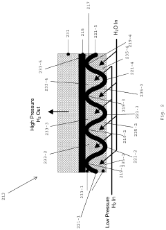 Technical Solution: Hydrogenics has developed advanced electrochemical hydrogen compression (EHC) technology that utilizes proton exchange membrane (PEM) cells to compress hydrogen without mechanical parts. Their system operates by applying voltage across the membrane, causing hydrogen ions to migrate from anode to cathode, effectively compressing hydrogen from low to high pressure. Their reliability testing protocol includes accelerated stress tests simulating over 10,000 operational hours, thermal cycling between -40°C and 85°C, and pressure differential tests up to 700 bar. They've identified key failure modes including membrane degradation, catalyst poisoning, and seal deterioration. Their proprietary membrane formulation shows 50% improved durability under high differential pressure conditions compared to standard membranes, with specialized coatings that reduce platinum catalyst degradation by approximately 30% during long-term operation.