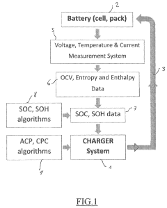 Effective thermal management is crucial for fast charging systems to prevent overheating that can damage batteries or reduce their lifespan. Advanced cooling techniques, including active cooling systems and heat dissipation materials, are integrated into battery management systems to maintain optimal temperature ranges during high-current charging. These systems can dynamically adjust charging rates based on temperature feedback, ensuring maximum charging speed without compromising safety or battery longevity.Expand Specific Solutions04 Adaptive Charging Algorithms