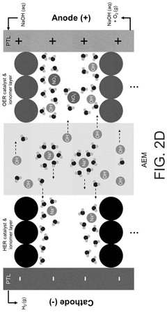 AEM electrolyzer field performance is enhanced through advanced monitoring and control systems that optimize operation based on real-time data. These systems include sensors for measuring voltage, current, temperature, pressure, and gas purity. Integration technologies enable the electrolyzer to operate efficiently with renewable energy sources, managing fluctuating power inputs while maintaining performance benchmarks. Remote monitoring capabilities allow for performance tracking and predictive maintenance to ensure optimal field operation.Expand Specific Solutions04 Environmental and operational condition impacts