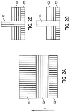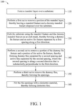 Technical Solution: TSMC has pioneered advanced FinFET patterning techniques with their multi-patterning technology (SAQP - Self-Aligned Quadruple Patterning) that enables scaling to 5nm and below. Their N5 process technology utilizes extreme ultraviolet lithography (EUV) combined with innovative FinFET structures to achieve higher transistor density. TSMC's approach incorporates pitch splitting techniques and self-aligned processes to overcome resolution limitations of traditional lithography. Their patterning solution includes specialized resist materials and advanced etch processes that maintain critical dimension uniformity across the wafer. TSMC has also developed unique strain engineering methods integrated into their patterning process to enhance carrier mobility in scaled FinFETs. Their N3 technology further refines these techniques with improved gate-all-around structures and reduced fin pitch, achieving approximately 70% logic density improvement over N5.