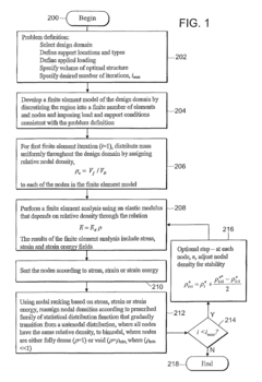 - A node-based approach using a family of probability distribution functions to transition from an initial uniform density state to a bimodal state of fully dense and void regions, ensuring constant mass and preventing numerical instabilities by interpolating nodal density values based on stress or strain energy, implemented as supplemental routines to standard finite element software.