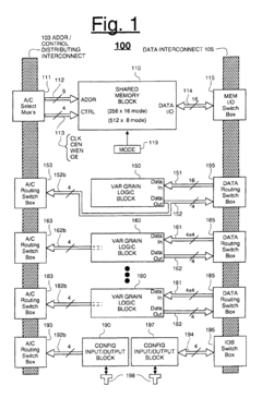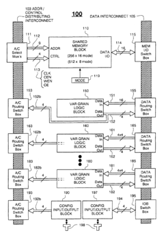 - The integration of configurable memory blocks that can operate in shallow-and-wide or deep-and-narrow modes, with programmable stitching of memory partitions and hardware blocks that prevent place-and-route software from disjoining general interconnect routes between adjacent memory partitions, allowing for flexible data I/O interconnect channels and efficient data routing.