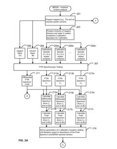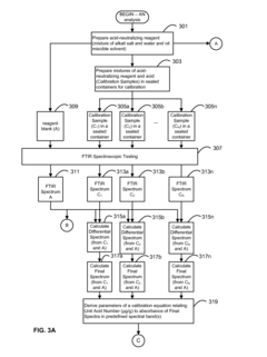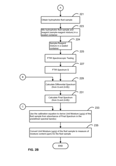 - A system and method using FTIR spectroscopy that involves preparing reagents reacting with the sample to produce carbon dioxide gas, allowing for calibration equations to be derived from standard mixtures, enabling precise measurement of moisture, acidity, or basicity by analyzing absorbance in specific spectral bands, which can be applied to various hydrophobic fluids and solid matrices.