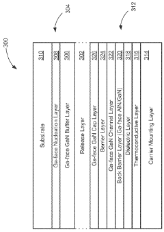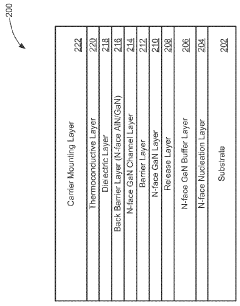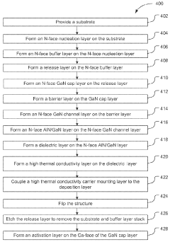 Advanced epitaxial growth methods are being developed to enhance the thermal conductivity of GaN layers. Techniques such as hydride vapor phase epitaxy (HVPE), metal-organic chemical vapor deposition (MOCVD) with optimized parameters, and molecular beam epitaxy (MBE) can produce GaN crystals with fewer defects and higher thermal conductivity. The growth conditions, including temperature, pressure, and precursor ratios, significantly influence the crystal quality and thermal properties of the resulting GaN material. Reduced dislocation density and improved crystal quality directly correlate with enhanced thermal conductivity.Expand Specific Solutions05 Integration of thermal management in device design
